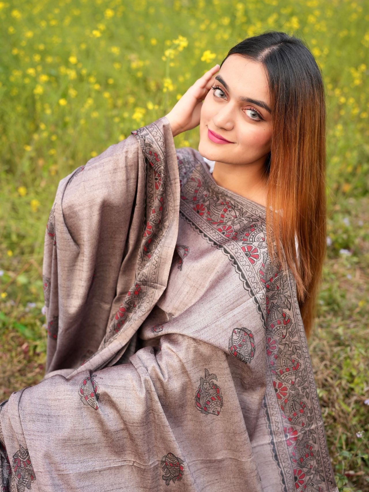 “Matsya” is a celebration of one of the most sacred symbols of Mithila art — the fish, revered as an emblem of prosperity, fertility, and divine abundance. Hand-painted in authentic Madhubani style, this dupatta features gracefully flowing Matsya motifs across the body, framed by intricately detailed traditional borders. Rendered in a refined palette of earthy neutrals, deep blacks, and rich reds, the artwork reflects centuries-old Mithila aesthetics while maintaining a sophisticated, contemporary elegance. Each stroke is carefully crafted by skilled artisans who preserve the traditional techniques passed down through generations. The dupatta drapes effortlessly, making it a versatile piece that complements both festive ensembles and heritage-inspired contemporary wear. “Matsya” is not just an accessory — it is a wearable expression of culture, symbolism, and refined Indian artistry.