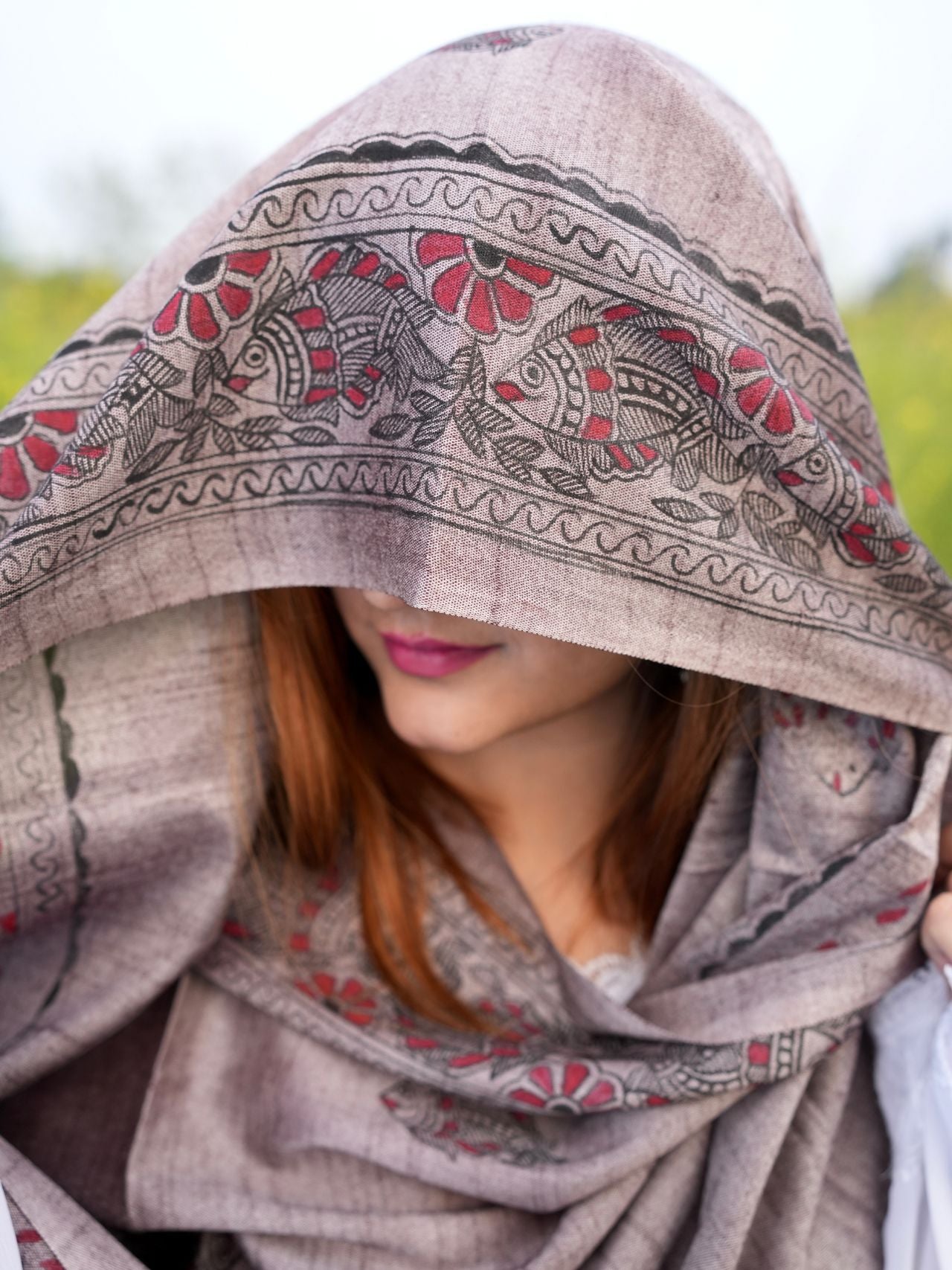 A hand-painted Madhubani dupatta adorned with sacred Matsya (fish) motifs — a symbol of prosperity, abundance, and timeless Mithila heritage. Elegant, authentic, and deeply rooted in tradition.