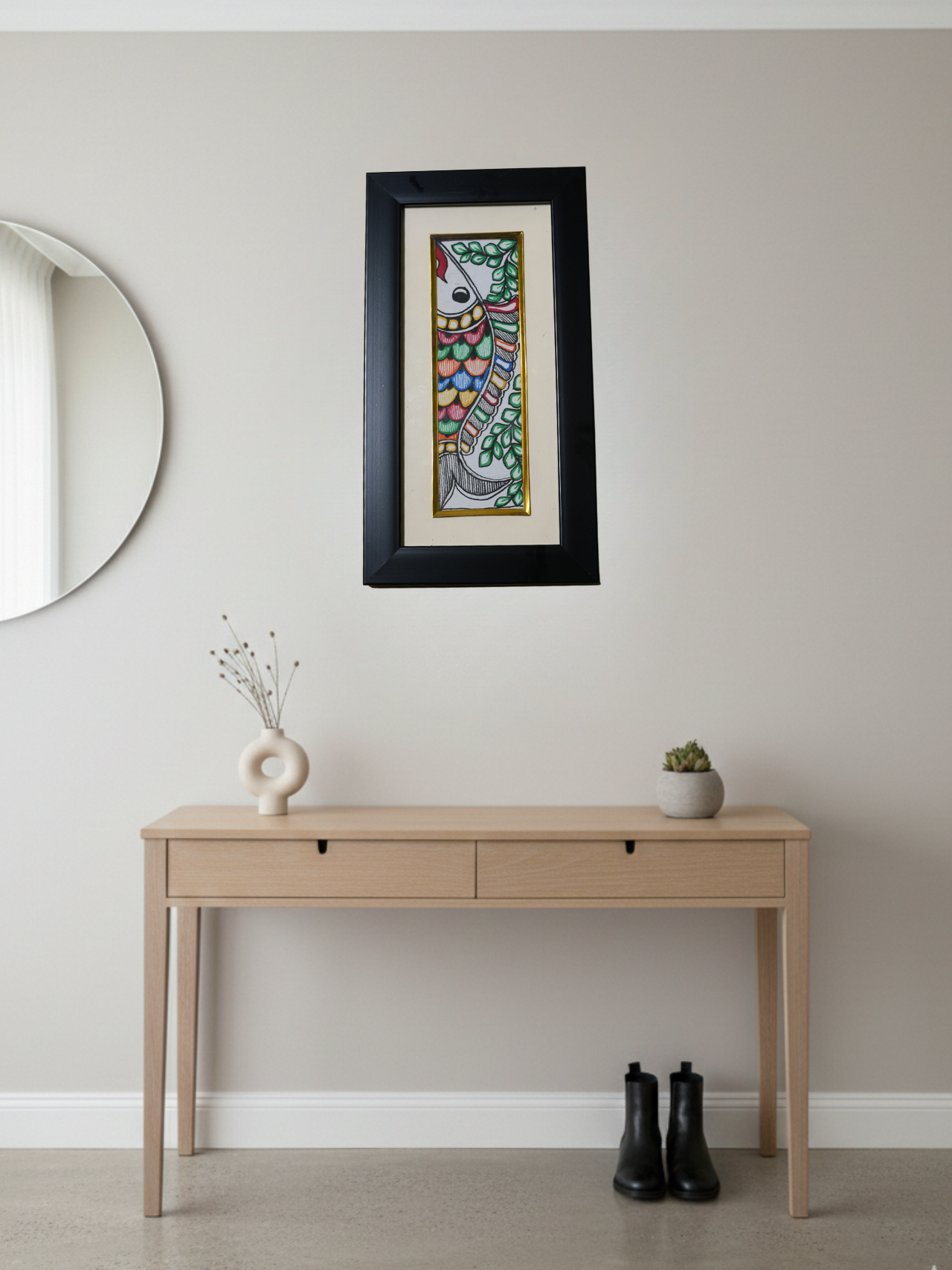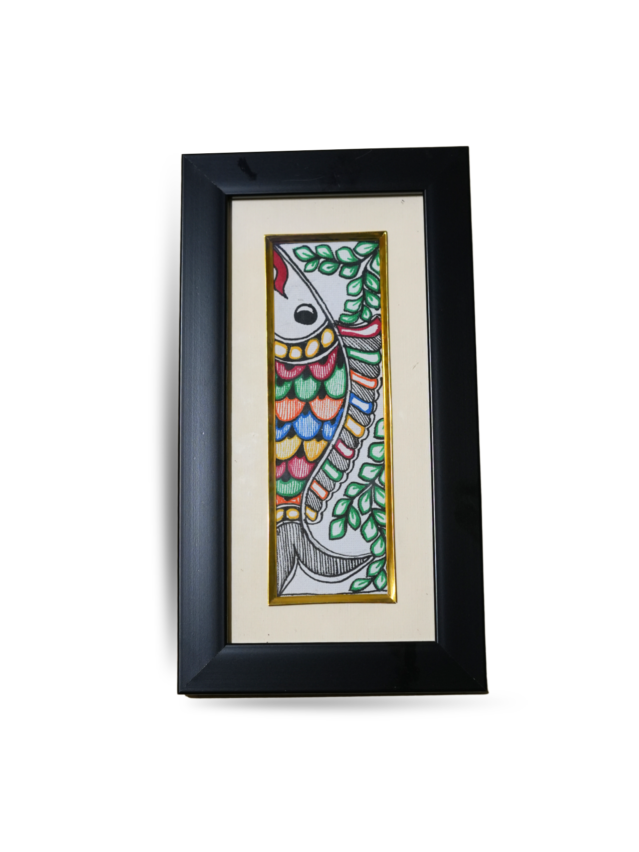 Introduce your space to the charm of Mini Mahi, a refined miniature artwork crafted in the timeless Mithila style. Painted meticulously by hand on premium canvas, this compact masterpiece showcases the graceful Mahi (fish) adorned with vibrant hues and intricate linework. Each stroke celebrates the cultural symbolism of prosperity, harmony, and good fortune — all encapsulated in a beautifully framed, bookmark-sized piece.