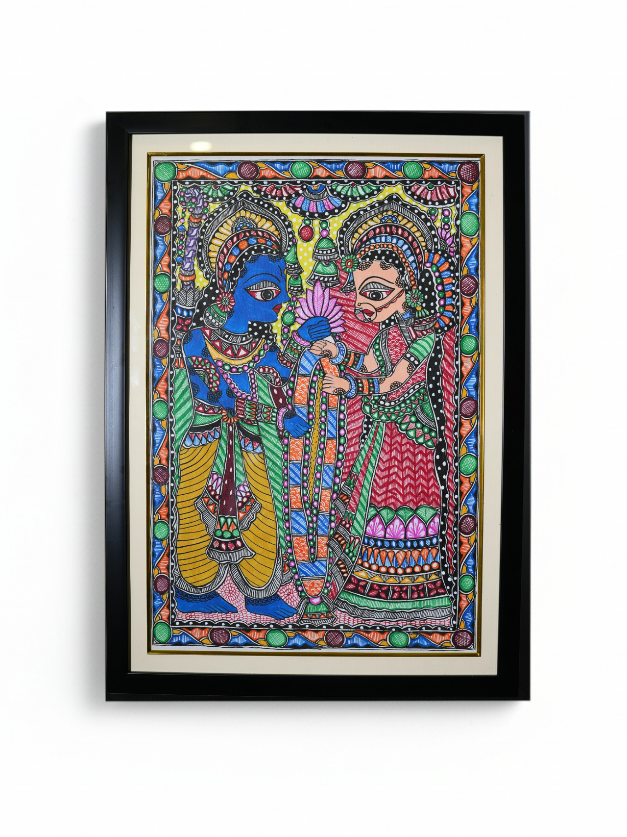 The composition captures the sacred moment of Ram and Sita’s union — symbolic of purity, devotion, and eternal love. Every detail, from the expressive eyes to the ornate borders, is meticulously handcrafted using high-quality acrylic and fabric colours on an authentic Madhubani cotton sheet.