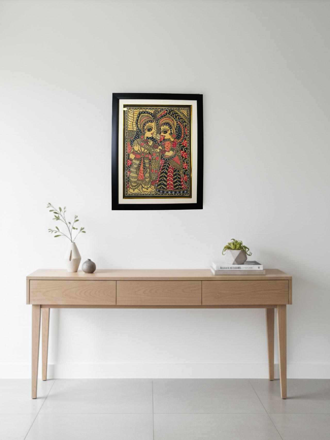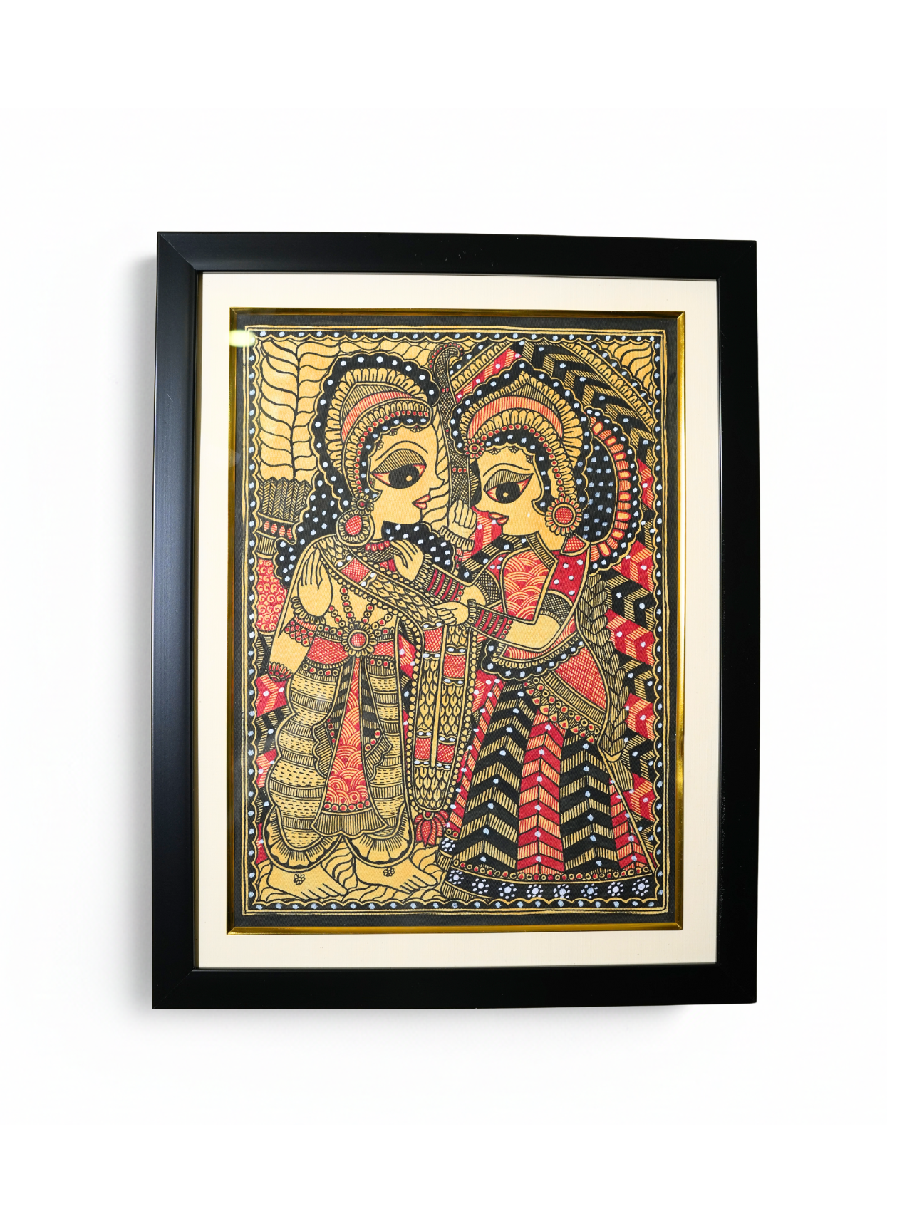 Introducing a premium creation from the Piyaraa Heritage Collection, this hand-painted Ram–Sita Madhubani piece radiates the grace of ancient Indian artistry. Crafted in a royal yellow undertone, enriched with deep reds, bold blacks, and intricate white highlights, the artwork carries the aesthetic of classical temple murals and traditional Mithila storytelling.